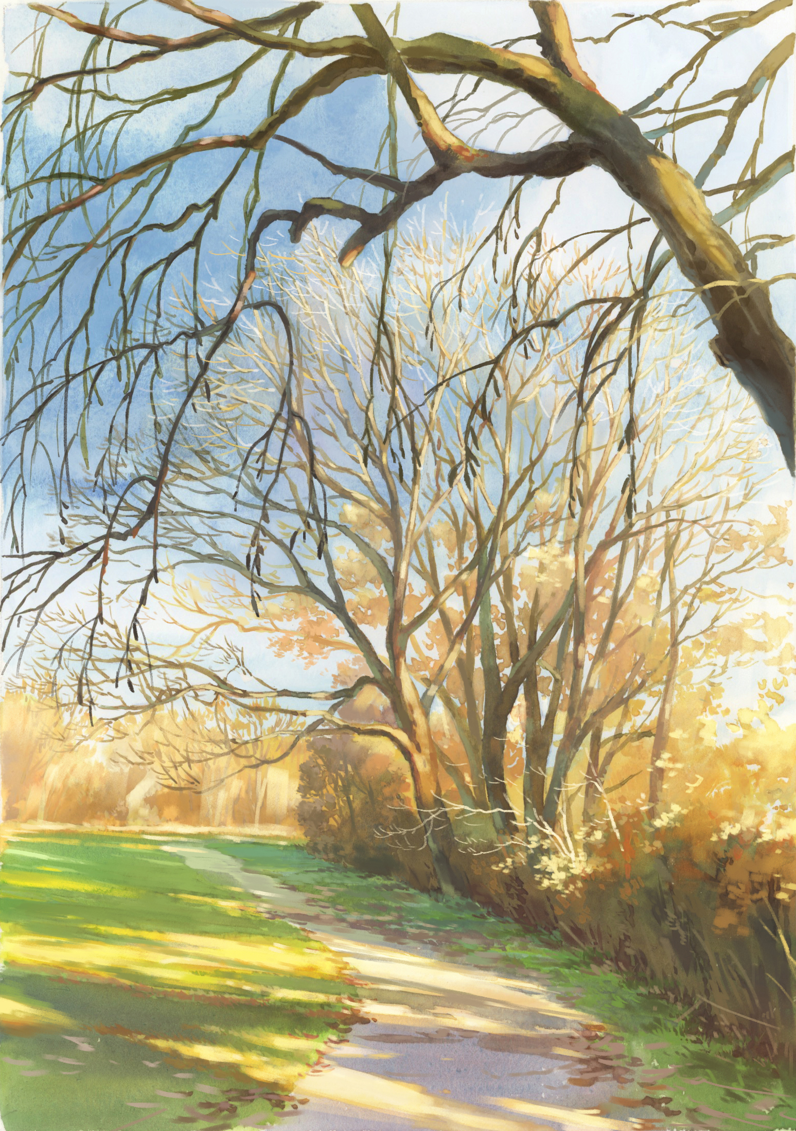 Watercolor park path curving through bare branches and golden trees in soft afternoon light.午後の柔らかな光の中、落葉した枝と黄金色の木々の間を曲がって続く公園の小道