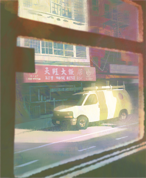View through a window onto a sunlit street with a white van and storefront signs, rendered in soft, misty colors. 窓越しに見える日差しの強い通り白いバンと店の看板が柔らかく霞んだ色合いで描かれている