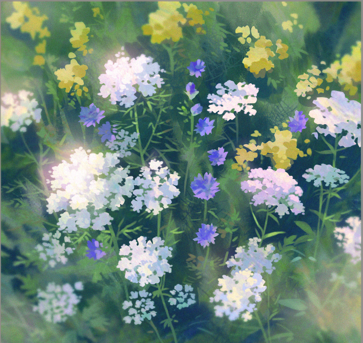 Soft-focus patch of wildflowers in white, yellow, and purple amid lush green foliage.緑の葉の中に野花がふんわりと咲く花畑