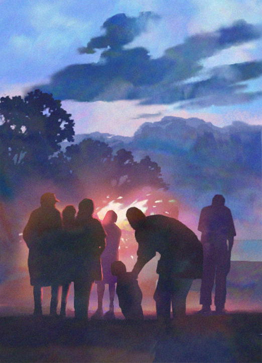 Silhouetted families watching fireworks glow through dusk haze beneath a wide evening sky.夕暮れの霞の中、花火の光を見上げる家族たちのシルエットと夜空