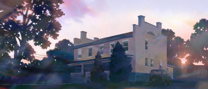 Country house at dusk with trees and a parked vehicle, bathed in soft twilight and mist.薄暮の田舎家。木々と停まった車が、柔らかな夕暮れの霧に包まれている