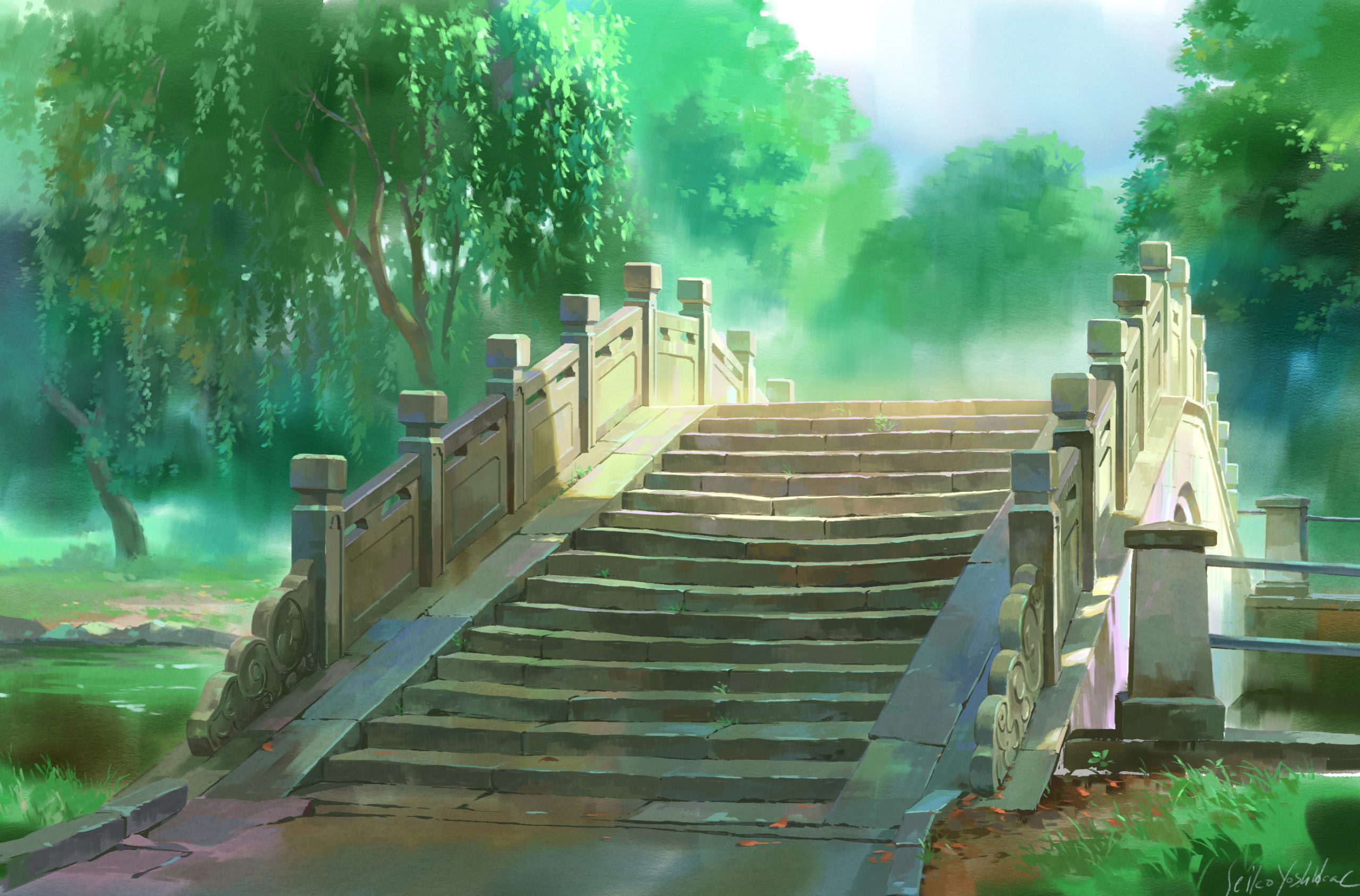 Stone bridge with wide steps rising over water, surrounded by lush green trees and morning mist.水辺に架かる石橋の広い階段。濃い緑と朝靄に包まれている