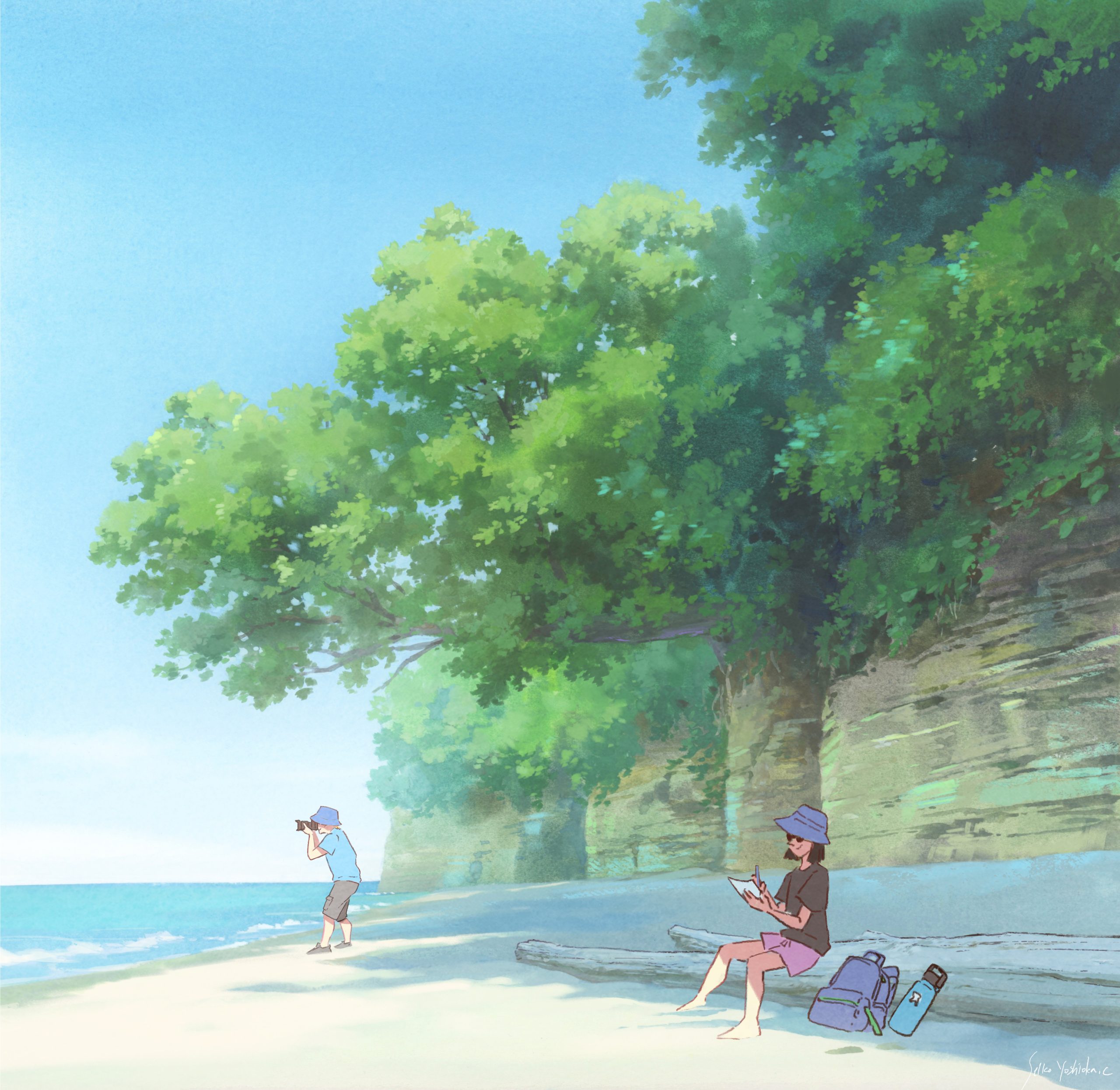 木々に覆われた崖の下の砂浜で、流木に座ってスケッチする人と、海辺で写真を撮る人。