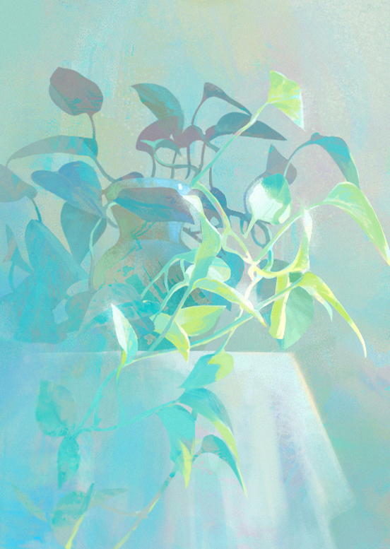 Soft, hazy still life of potted plant leaves glowing in cool light, painted in pale greens and blues.淡い青緑の光に透ける鉢植えの葉を描いた、柔らかく霞んだ静物画