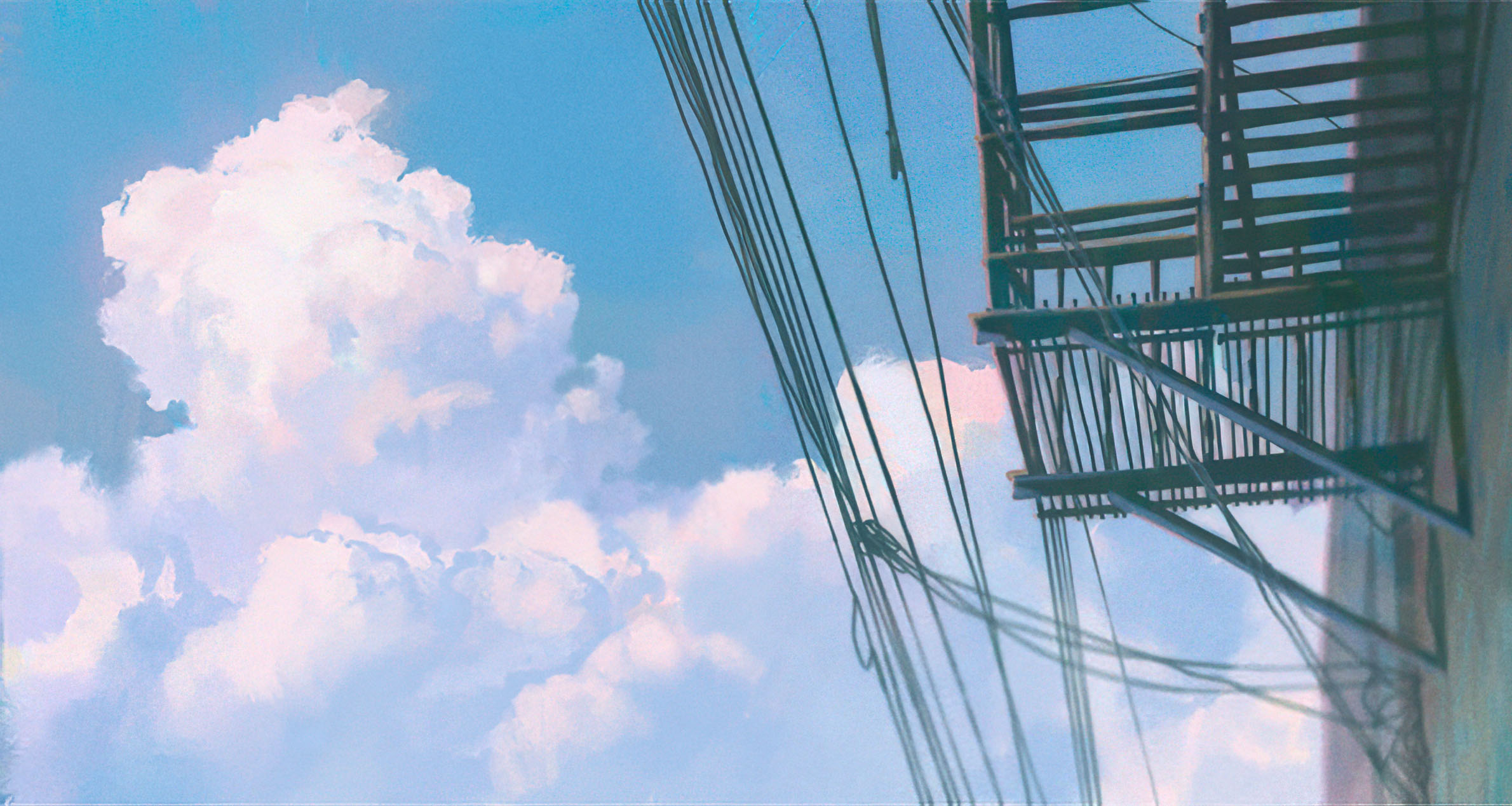 Looking up at bright summer clouds with power lines and a metal fire escape cutting across the blue sky.青空に浮かぶ夏雲、電線と外階段(非常階段)が空を斜めに横切っている