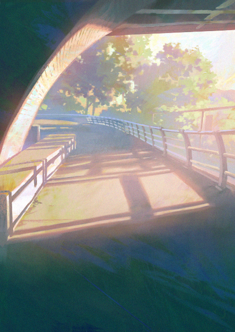 Sunlit path under an overpass, with long shadows and a railing leading toward bright trees ahead.高架下の遊歩道、長い影と手すりが続き、奥の木々の光へと導いている