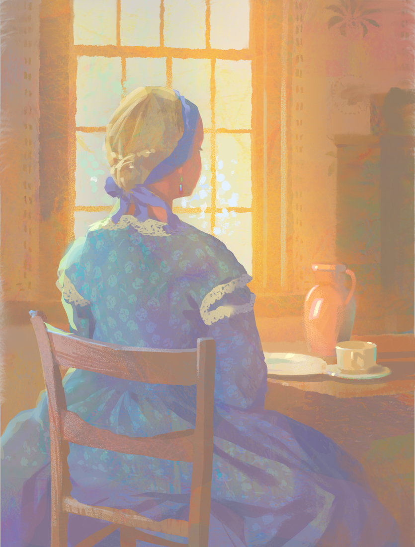 Woman in a blue dress sits with her back to the viewer, facing a glowing window beside a cup and pitcher. 青いドレスの女性が後ろ姿で座り、差し込む光の窓を見つめている傍らにカップと水差し