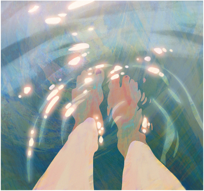 POV of legs and feet in clear water, with bright ripples and reflections circling around.水面に足を浸した視点きらめく波紋と反射が周囲に広がっている