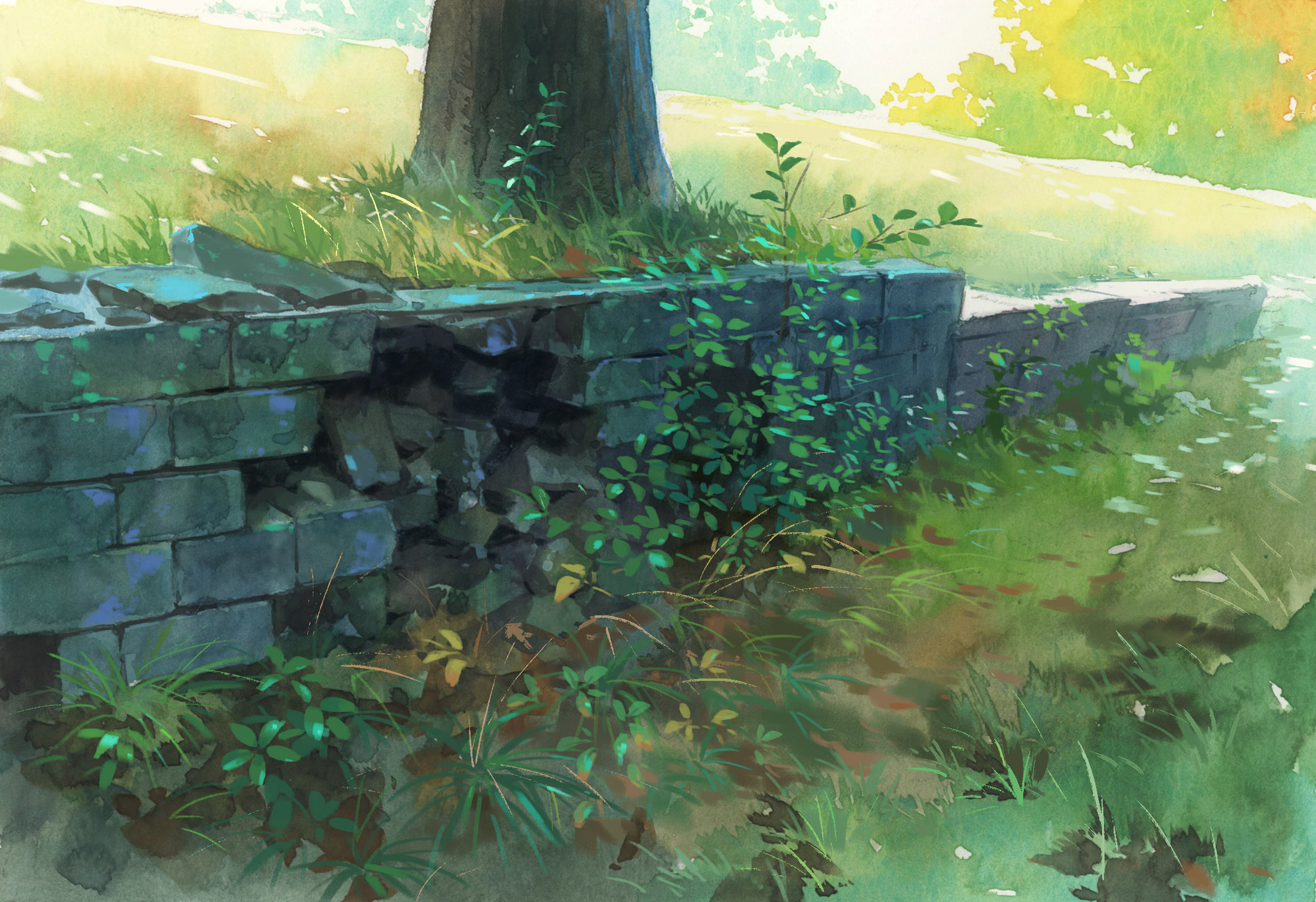 Sunlit stone wall and grass with a tree base, scattered leaves, and lush plants in dappled shade.日差しを浴びた石壁と草地、木の根元、散らばる落ち葉、木漏れ日の下で茂る植物たち
